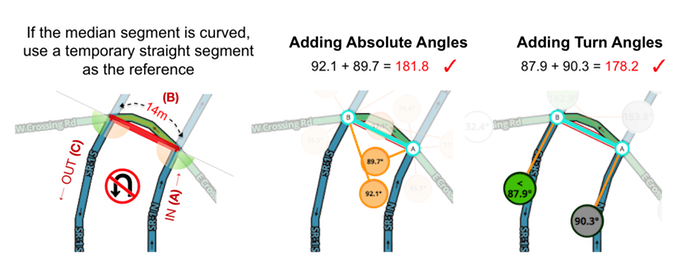 Condition #3 for U-turn prevention requires that the in and out segments (A and C) are within ±5º of parallel to each other. This is checked by using a straight median segment as the reference and the Junction Angle Info (JAI) browser extension to measure angles. JAI may be set for absolute or turn angles; using either is OK.
