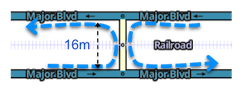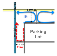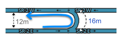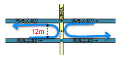 A median segment 52.49 ft (16 m) or longer will always allow a U-turn | While condition #3 requires a straight segment for determining parallel in and out segments, condition #2 is the measure of the length of the median segment itself. Be careful when the space between the divided road is small. Ensure the U-turn segment is 52.49 ft (16 m) or longer by adjusting geometry. A median segment of any shape can trigger a U-turn penalty between parallel roads if it is not long enough. |