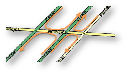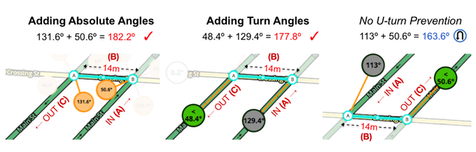 To ensure proper routing between two closely spaced parallel roads, connect the two with a segment 52.49 ft (16 m) or longer | U-turn prevention triggers for both double-left and double-right turns over any road type. If the three conditions for median U-turn prevention are met, a large penalty will be applied, irrespective of whether the turn is onto the same road in the opposite direction or onto a completely different road. Both double-left and double-right turns can be penalized, regardless of country, and can occur for one way or two way segments. |